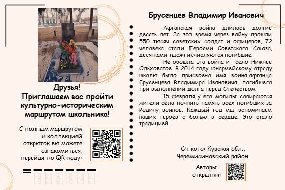 Не обошла эта война и село Нижнее Ольховатое. В 2014 году юнармейскому отряду школы было присвоено имя воина-афганца Брусенцева Владимира Ивановича, погибшего при выполнении долга перед Отечеством.